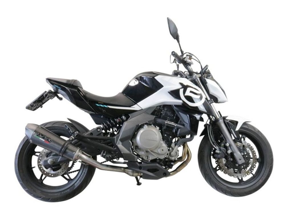 Tlumič výfuku má kuželovitý tvar se speciální geometrií, která začíná průměrem 90 mm a rozšiřuje se až na 130 mm v obvodu; jeho délka se liší podle typu motocyklu. Má tělo z nerezové oceli s povrchovou úpravou imitující karbon, nerezové koncovky vyrobené CNC obráběním a pětiúhelníkový výstup s dB killerem. Kulatý kuželový tvar má rozměry 390 × 130 mm.