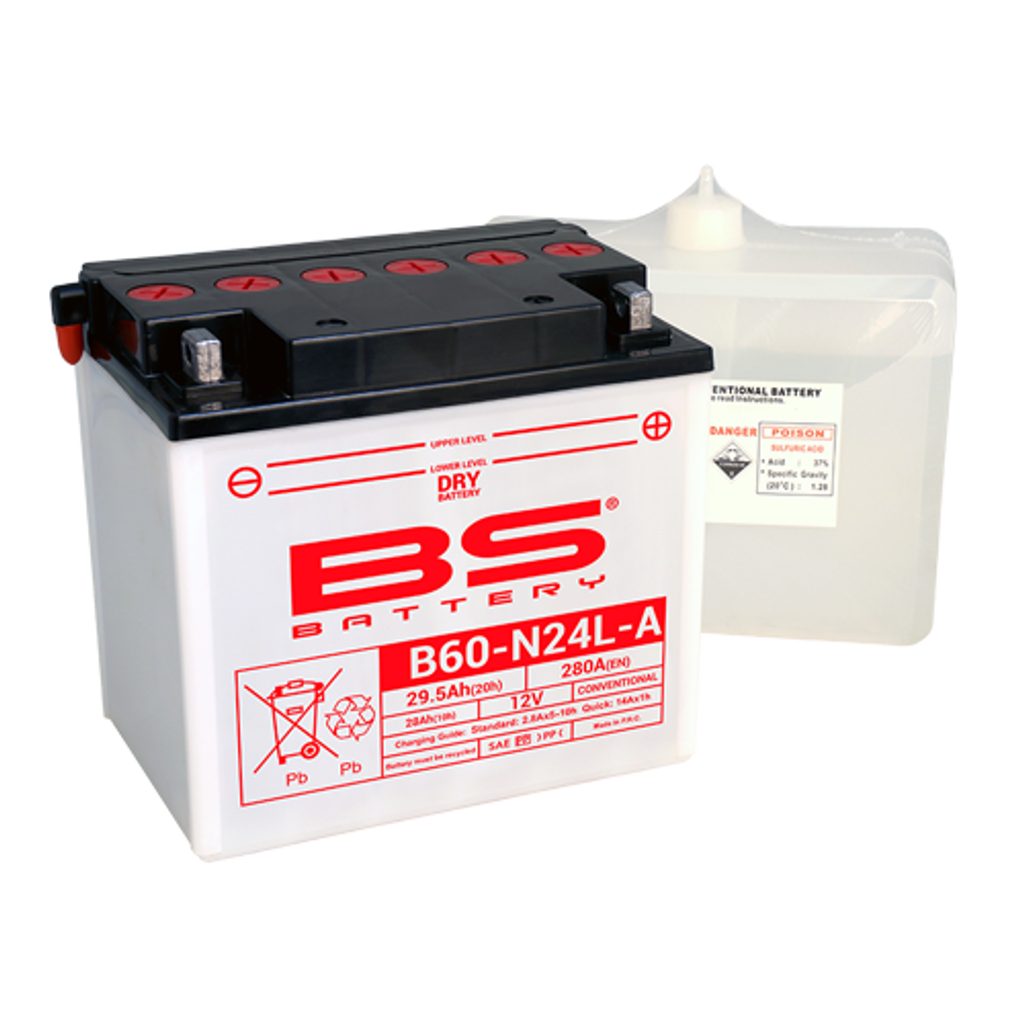 Baterie B60-N24L-A patří do naší řady DRY. Je speciálně navržena tak, aby poskytovala dobrý výkon a spolehlivost. Tato konvenční baterie 12 V / 29,5 Ah je dodávána s balením kyseliny, musí být před prvním použitím aktivována a je nutné ji pravidelně kontrolovat. Díky technologii DRY nevyžaduje baterie během dlouhodobého skladování žádnou údržbu.
