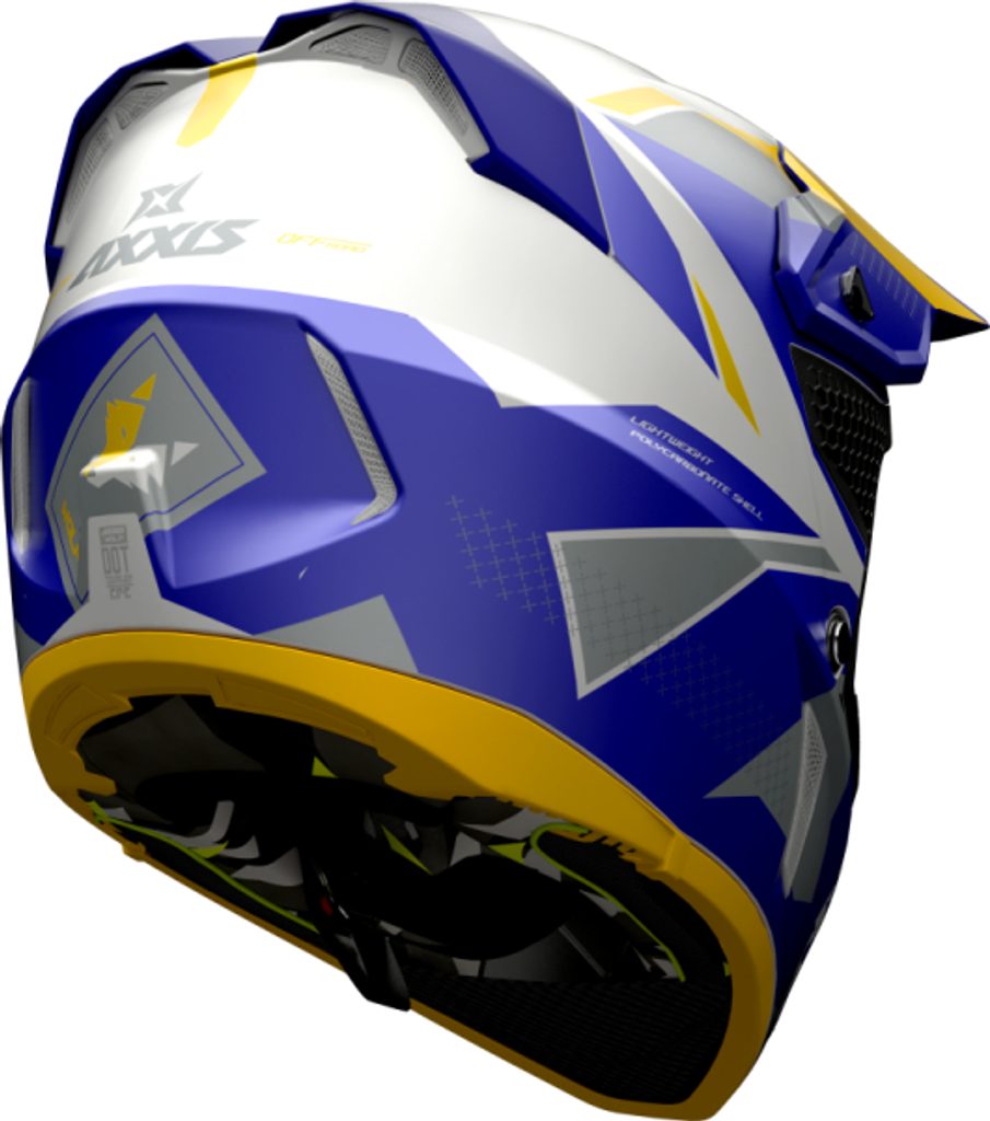 Přilba AXXIS WOLF vyniká atraktivním designem, robustní konstrukcí a je zaměřena na maximální ochranu a pohodlí motokrosového jezdce. Skořepina je vyrobena z ABS ve dvou velikostech. Díky tomu je možné zachovat u menších velikostí nižší hmotnost. WOLF váží ve velikostech XS-M pouhých 1400 ± 50 g a ve velikostech L-2XL 1500 ± 50 g.