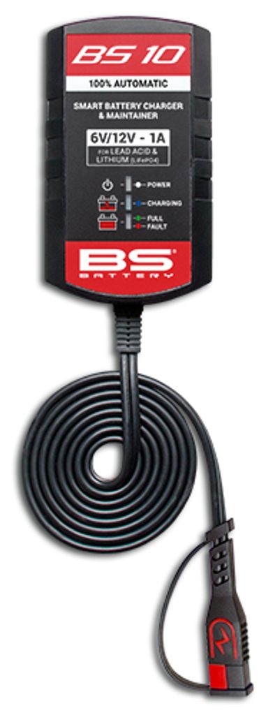 BS Charger BS 10 je automatická chytrá nabíječka a udržovací zařízení pro olověné a lithiové baterie s napětím 6 V / 12 V a nabíjecím proudem 1 A. Díky kompaktnímu a lehkému provedení je ideální na cesty a je vhodná pro akumulátory s kapacitou až 20 Ah.