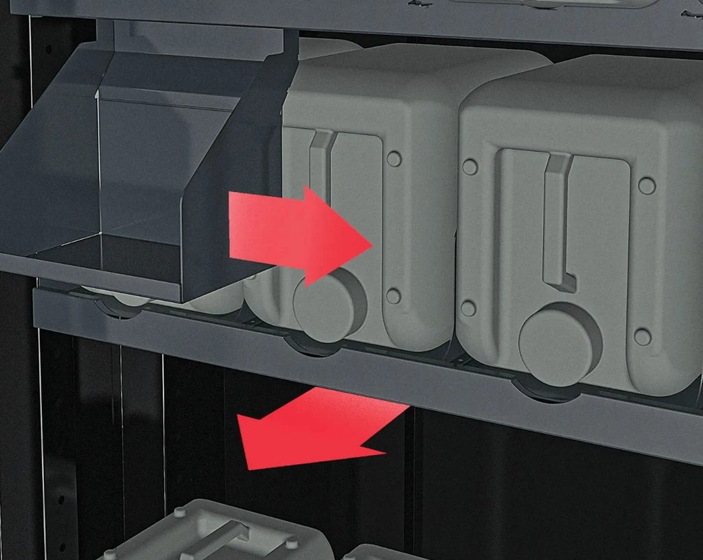 Skříň na skladování olejů vybavená zámkem na klíč, třemi výsuvnými a výškově nastavitelnými policemi, záchytnou vanou na olej a ventilačními otvory pro cirkulaci vzduchu.