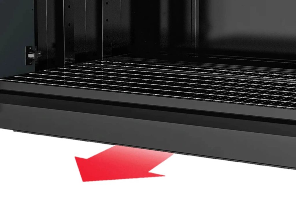 Skříň na skladování olejů vybavená zámkem na klíč, třemi výsuvnými a výškově nastavitelnými policemi, záchytnou vanou na olej a ventilačními otvory pro cirkulaci vzduchu.