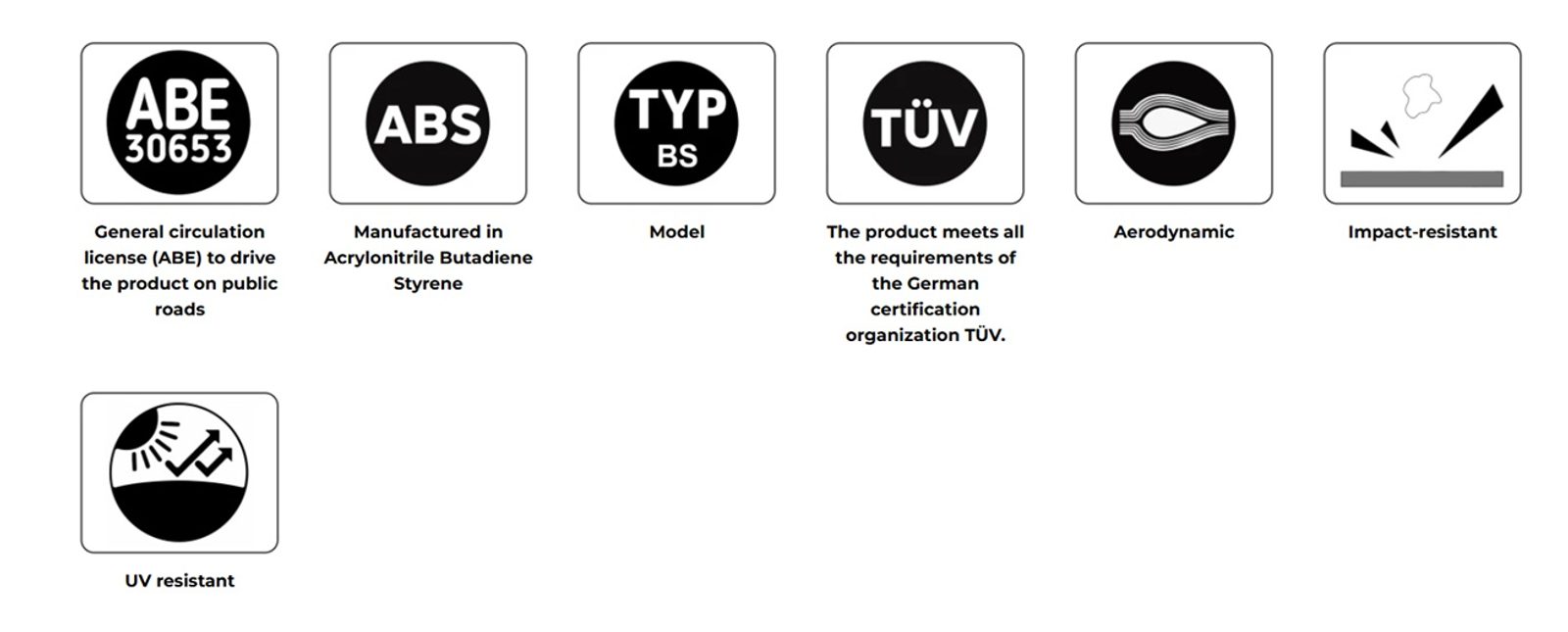 Jsou vyrobeny s využitím nejmodernějších technologií a jejich komponenty jsou z hliníku a/nebo ABS materiálu, které jsou vysoce odolné proti nárazům a UV záření, zároveň jsou lehké a trvanlivé. Plastové části mají integrovanou povrchovou úpravu, která zlepšuje odolnost vůči chemickým látkám a zároveň poskytuje plnou ochranu proti UV záření. Tato vrstva zároveň eliminuje nutnost lakování spoileru. Kovové držáky jsou vyrobeny z 2mm kovu s antikorozní úpravou, jsou odolné a snadno se instalují.