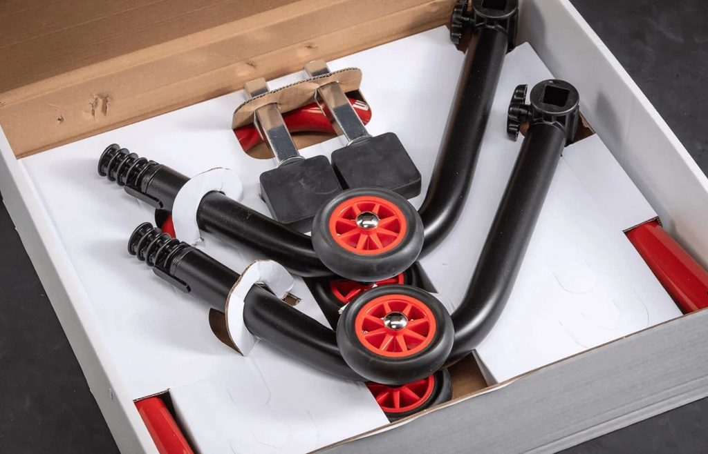 Patentovaný zadní stojan na motorku dodávaný ve třech snadno montovatelných dílech - lze ho sestavit bez použití šroubů a šroubováků.