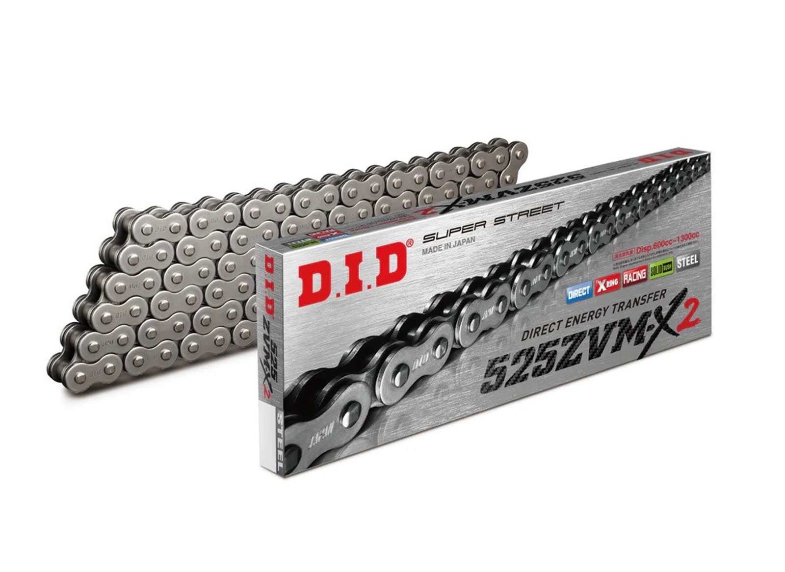 Řetěz D.I.D ZVM-X Series využívá patentované těsnění X-Ring®, které zajišťuje vyšší pevnost než řada VX a je určen pro silné motocykly s vysokým krouticím momentem a výkonem. Díky kroucenému tvaru X-Ring® těsnění lépe těsní a čtyři styčné body snižují ztráty výkonu.